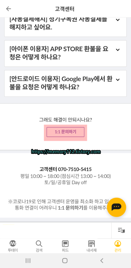 어떤 이유에서인지는 모르겠지만 나는 해지 신청 버튼을 아무리 눌러도 자동결제 해지가 처리되지 않았다. 그래서 1대1 문의하기를 통해 처리하기로 했다.