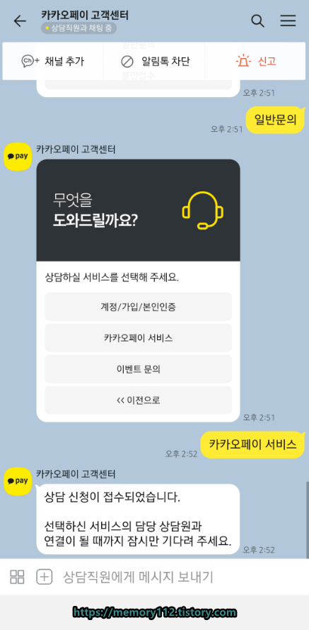 이어서 카카오페이 서비스를 선택해준다. 그러면 상담 신청 접수가 완료된다. 이제 상담원과 연결될 때까지 기다리기만 하면 된다. 그런데 이상하게도 30분이 지나도 상담원과의 연결은 이루어지지 않았다. 상담이 많이 밀린 것일까..? 아무리 기다려도 상담원과는 연결이 되지 않아서 카카오페이 고객센터에 전화를 하기로 했다.