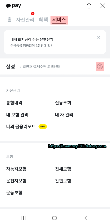 서비스 탭으로 이동한 후, 설정을 눌러준다.
