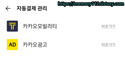 자동결제가 연결되어있는 가맹점을 확인하기 위해. 카카오페이 설정 메뉴에 있는 '자동결제'로 들어가봤다.