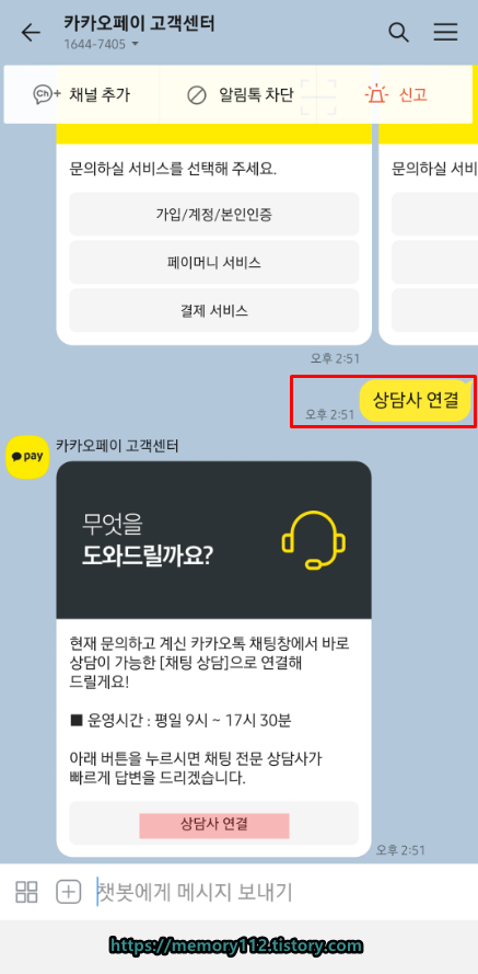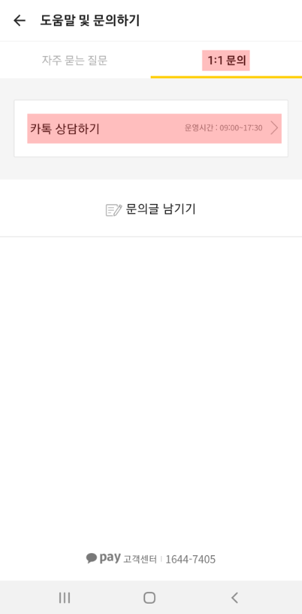 1:1 문의 탭으로 가면 '카톡 상담하기'라는 것이 보이는데. 그것을 누르면 카카오페이 고객센터 상담톡과 연결된다. 참고로 카톡 상담하기 운영 시간은 09시부터 17시 30분이다.