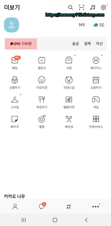 카카오페이 고객센터 이용은 전화 또는 상담톡을 통해 가능하다. 먼저 간편한 상담톡을 이용해보자. 상담톡 이용을 위해 카카오페이 메뉴로 들어가 준다.