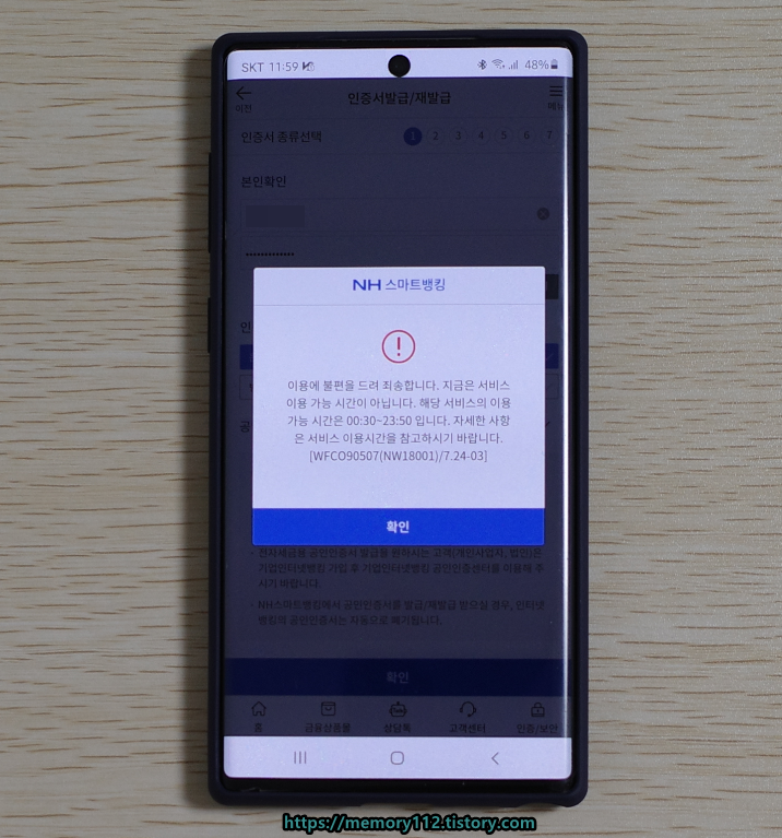 참고로 공인인증서 발급 시간은 00시 30분부터 23시 50분까지입니다. 이 시간은 은행 점검 시간을 제외한 나머지입니다.