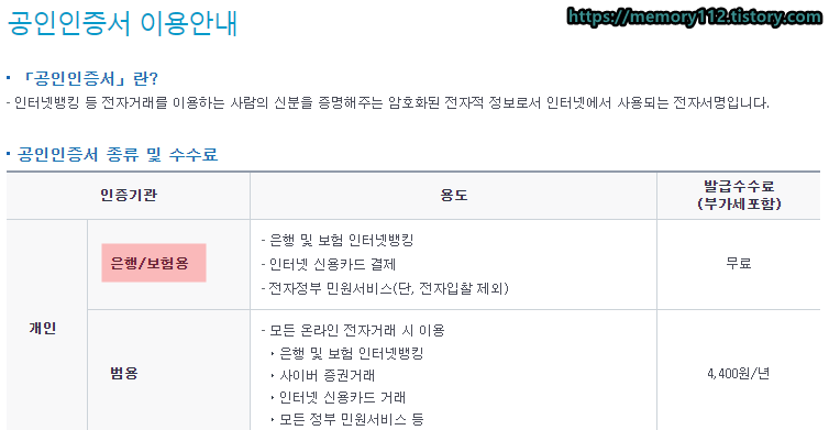 그리고 '은행/보험용'과는 조금 다른 범용 공인인증서라는 것도 있는데요. 범용 공인인증서는 은행뿐만 아니라 증권, 보험사, 전자세금계산서 발행, 나라장터 등 모든 용도로 사용할 수 있는 인증서를 말합니다. 발급 수수료는 1년에 4,400원입니다. 참고로 갱신할 때도 4,400원의 수수료가 붙습니다. 보통 범용 공인인증서는 사업자가 있는 사람이 발급받습니다.