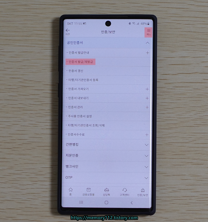 우측 상단에 있는 메뉴 버튼을 누른 후, 이어서 '공인인증서 발급/재발급'을 눌러줍니다.