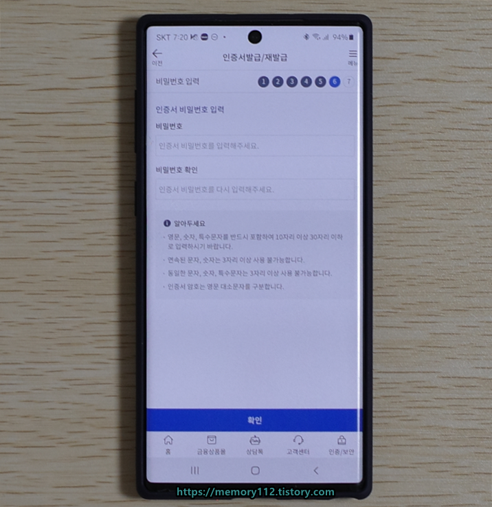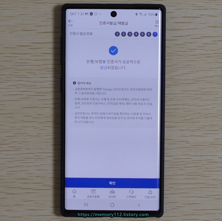 비밀번호 설정을 끝으로 공인인증서 발급이 완료됩니다. 발급받은 공인인증서는 스마트폰에 자동 저장됩니다. 공인인증서의 유효기간은 1년이며, 1년마다 갱신해서 사용해야 합니다. 참고로 공인인증서 갱신은 인터넷이나 모바일로 쉽게 처리할 수 있습니다.