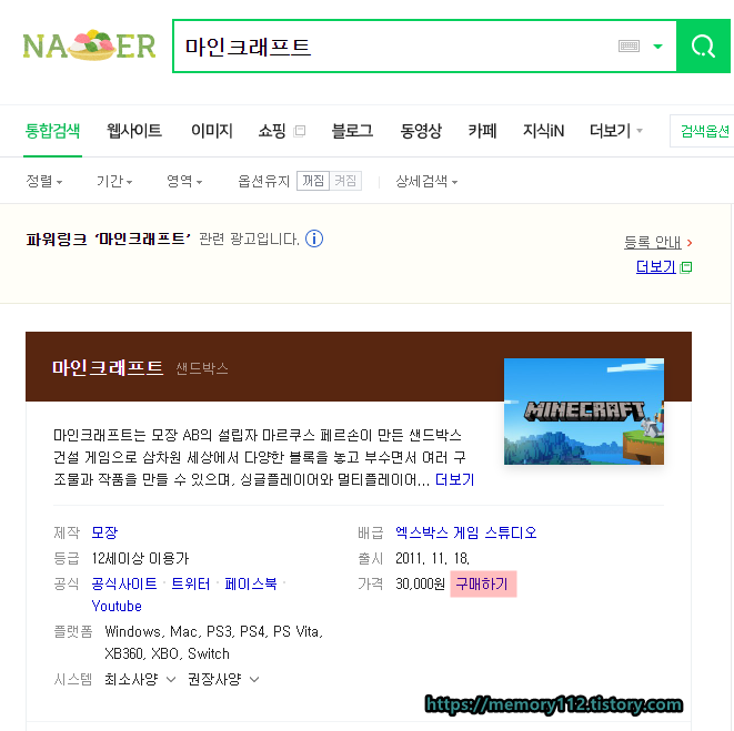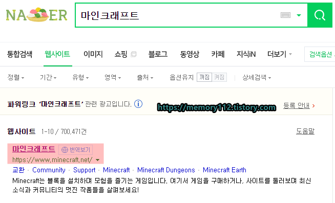 마인크래프트 공식 홈페이지 찾기가 어렵다면, 초록창에 '마인크래프트'라고 검색하고 아래에 있는 구매하기 버튼을 눌러도 됩니다.