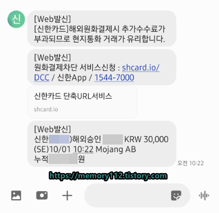 저는 이렇게 마인크래프트를 원화로 30,000원 결제했는데요. 원화로 결제하니 추가 수수료가 부과된다며 문자로 친절히 안내를 해주네요. 원래는 해외 결제 시 현지 통화(달러면 달러)로 결제하는 것이 국룰이긴 합니다만. 저는 달러로 바꾸는 것을 까먹었기 때문에 추가 수수료를 내게 생겼죠. 다행히도 결제 금액이 적기 때문에 추가 수수료는 1,000원 이하로 나올 것 같네요.