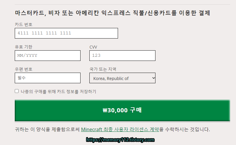 해외 결제가 가능한 마스터카드, 비자 또는 아메리칸 익스프레스 카드 정보를 입력해줍니다. 체크카드나 신용카드 상관없이 본인이 편한 것으로 입력하면 됩니다. 화면에 보이는 것처럼 '\30,000' 즉, 우리 원화로 결제하면 추가 환전 수수료(DCC)가 들어갑니다. 추가 환전 수수료가 부과되지 않으려면 나라를 미국으로 바꿔서 달러로 결제해야 합니다. 이 부분은 끝에 자세히 서술하도록 하겠습니다.