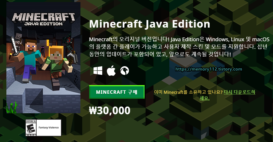 마인크래프트는 공식 홈페이지에서 쉽게 구매할 수 있습니다. 참고로 현재 스팀에서는 구매할 수 없는 게임입니다.