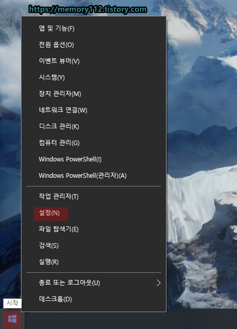 네트워크 초기화 기능 이용 방법은 매우 간단합니다. 먼저 좌측 하단에 있는 시작 버튼을 누른 후, '설정(N)'을 눌러줍니다.