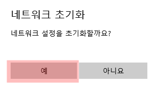 여기서 '예' 버튼을 눌러줍니다. 그러면 5분 후에 윈도우가 종료된다는 안내 문구가 뜰 텐데요. 안내 문구 이후, 5분이 지날 때까지 기다리지 마시고, 그냥 직접 재부팅을 해줍니다. 재부팅하면 초기 설정대로 네트워크가 다시 잡힐 것입니다.