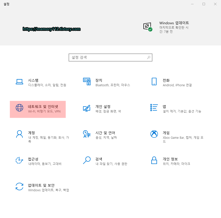 여기서 '네트워크 및 인터넷'을 눌러줍니다.