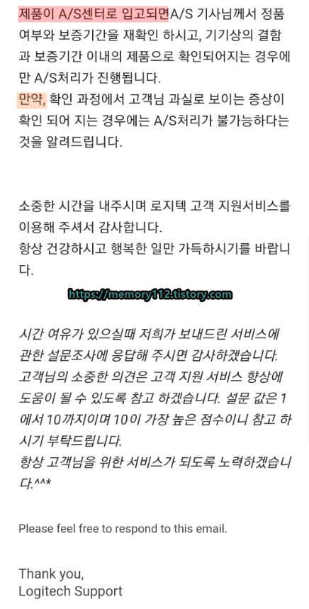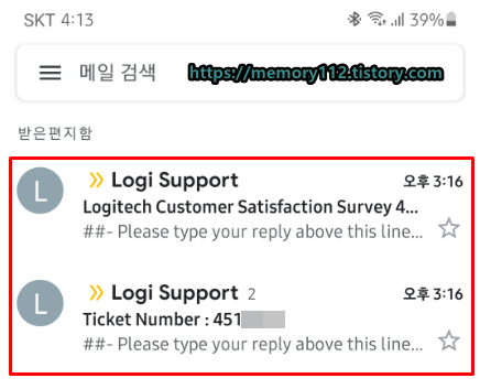 통화 종료 후, 조금 기다리니까 로지텍 고객센터에서 메일이 2통 왔어요.