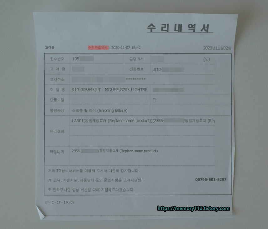 제품과 같이 온 수리 내역서입니다. 불량 증상은 '스크롤 휠 이상'이라고 적혀있고, 처리 결과는 '동일제품교체'로 적혀있네요. 다시 말해, 새 제품으로 왔다는 말이죠.