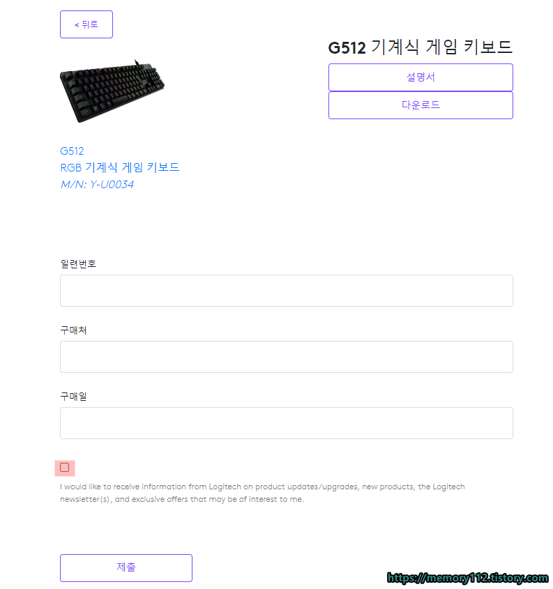 일련번호, 구매처, 구매일을 모두 입력한 후 아래에 있는 제출 버튼을 눌러줍니다.