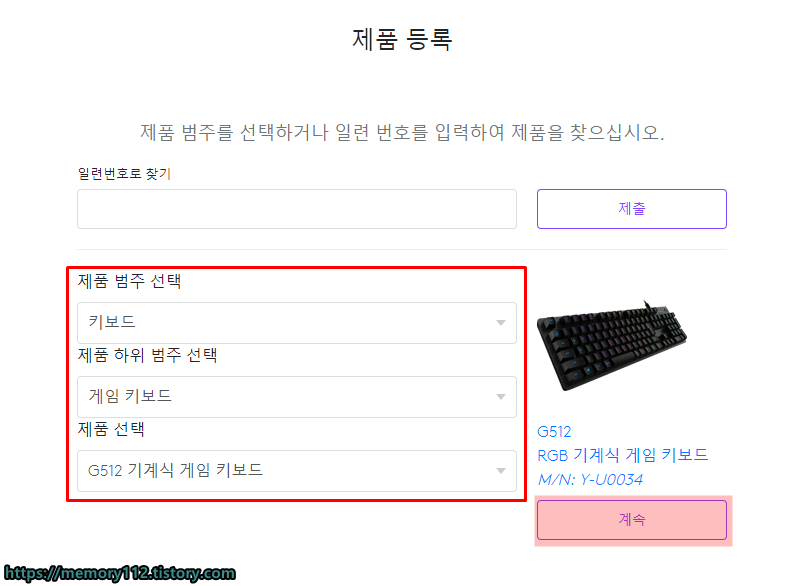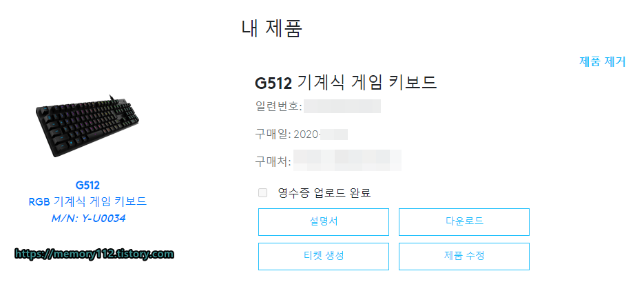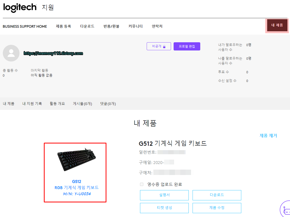 우측에 보이는 '내 제품'을 누르면, 방금 등록한 제품이 목록에 나올 것입니다. 제가 등록한 제품은 G512 기계식 게임 키보드입니다.