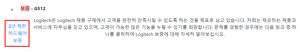 그리고 그 아래에는 등록한 제품의 보증 기간이 안내됩니다. 로지텍 G512 기계식 키보드의 경우에는 보증 기간이 2년이네요.