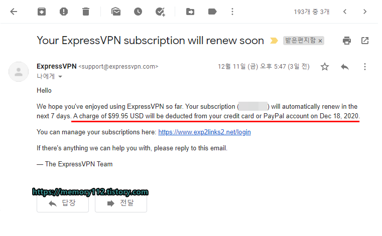 어느날 ExpressVPN에서 메일이 하나 왔다. 메일 내용은 7일 이내에 ExpressVPN 1년 이용 요금 99.95달러(원화로 11만원 정도)가 결제될 것이니 참고하라는 것이었다. 벌써 1년이나 되었다니.. 원화로 1년치 요금 11만원.. 갱신 기간이 다가오니 생각이 많아진다.