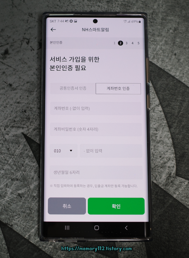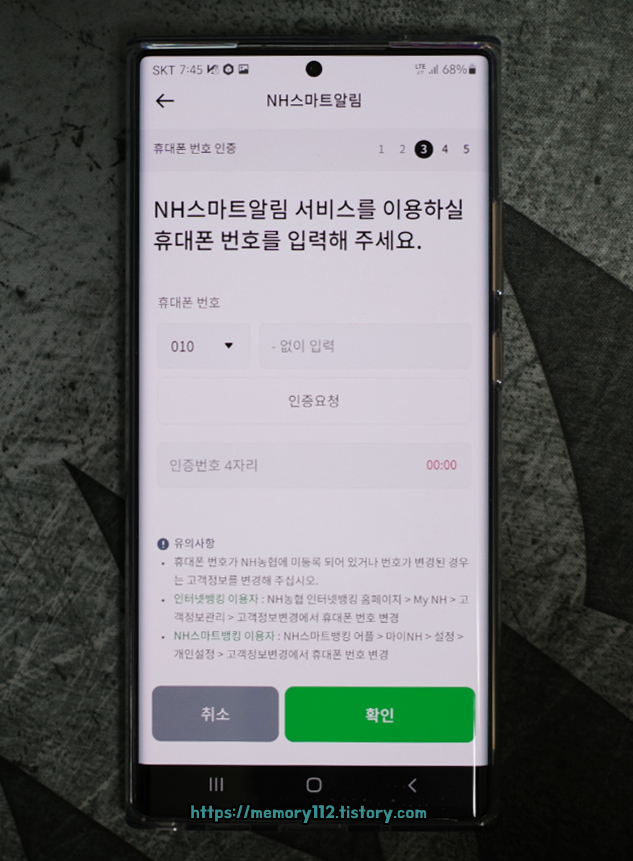 이번에는 NH스마트알림(입출금 알림) 서비스를 이용할 휴대폰 번호를 입력해줍니다.