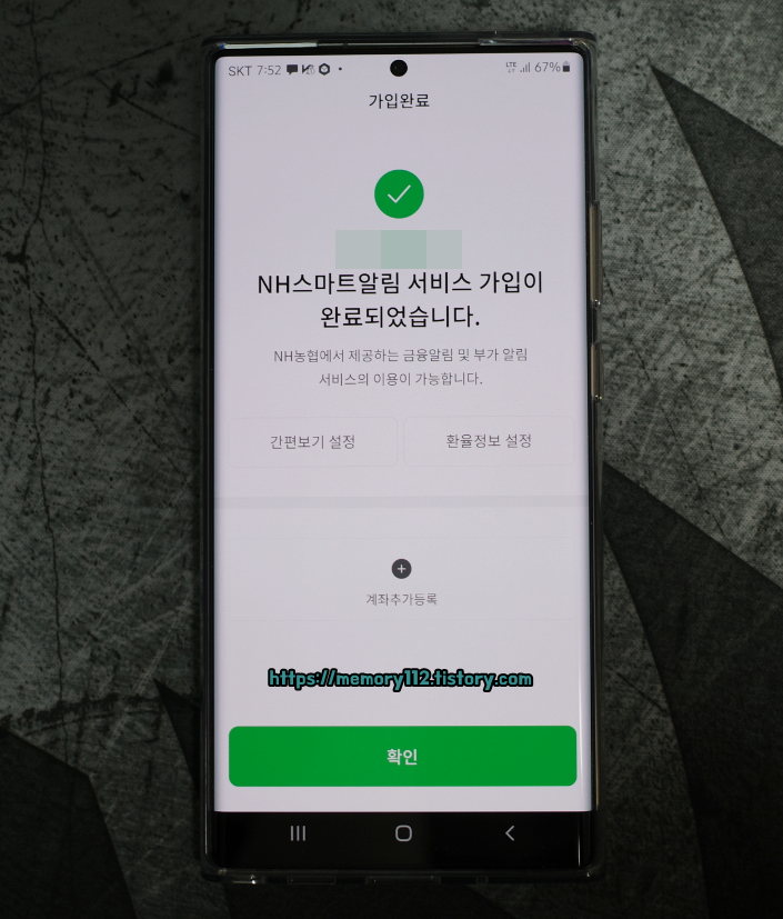그러면 이렇게 NH스마트알림 서비스 가입이 완료됩니다. 이제부터 입출금 알림을 해당 앱 알림을 통해 실시간으로 받을 수 있습니다. 물론 무료로 말이죠.