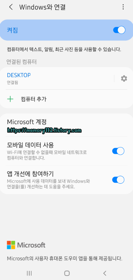 스마트폰으로 넘어와서, 상단바를 내리면 위와 같이 'Windows와 연결'이라는 것이 보일 겁니다. 이것을 터치해줍니다.