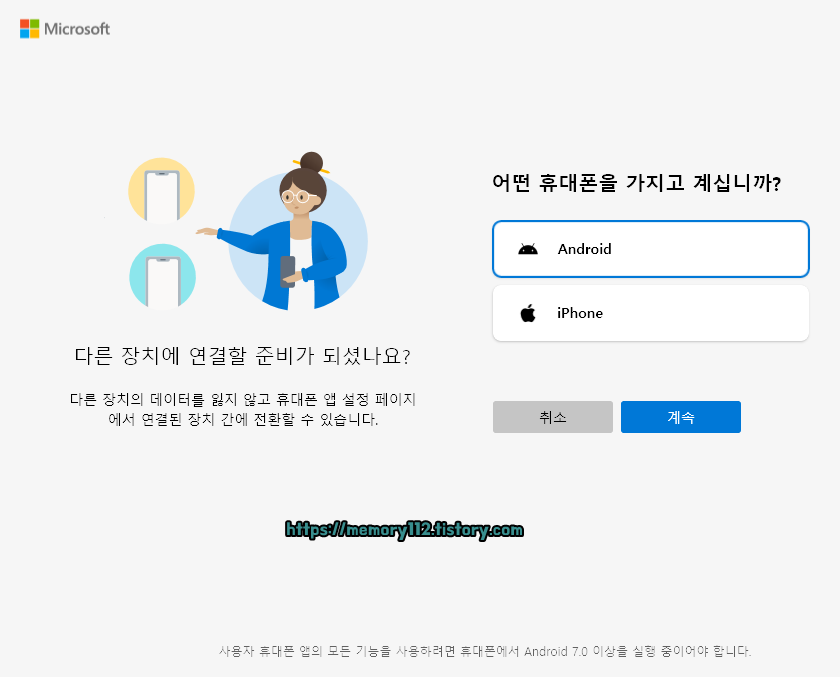 본인 휴대폰이 안드로이드폰인지 아이폰인지 선택한 후, 계속 버튼을 눌러줍니다.