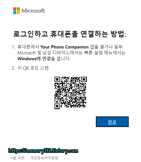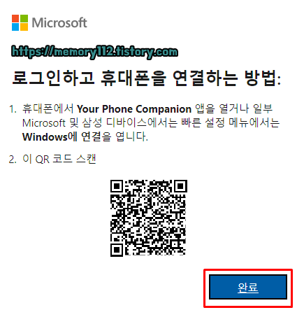 스마트폰 화면에서 QR 코드 스캔을 완료했다면, PC로 돌아와 완료 버튼을 눌러줍니다. 이 완료 버튼만 눌러주면 PC에서의 설정은 끝입니다.