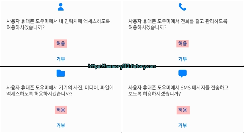 필요한 권한은 "연락처, 전화, 사진, 미디어, 파일, SMS 메시지"입니다. 모두 '허용'을 해줍니다.