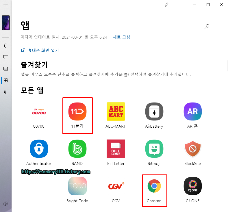 그리고 앱 메뉴에는 '휴대폰 화면 열기'라는 것이 있습니다. 이것을 클릭하면 PC에서 휴대폰 화면을 제어할 수 있는 '미러링'을 할 수 있는 것이죠.