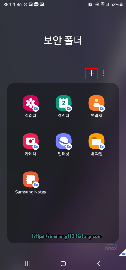 이번에는 보안폴더에서 사용할 앱을 추가해볼까요? 우측 상단에 보이는 '+'를 눌러줍니다.