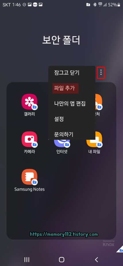 이번에는 보안 폴더에 파일을 하나 추가해볼까요? 우측 상단에 점이 3개 찍힌 것(더보기)을 누르고, '파일 추가'를 눌러줍니다.