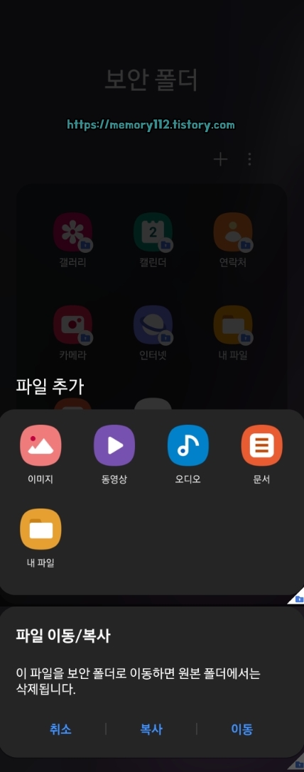 어떤 종류(이미지, 동영상, 오디오, 문서, 내파일)의 파일을 추가할 것인지 선택해줍니다. 그리고 해당 파일을 이동할 것인지 복사할 것인지도 선택해줍니다.