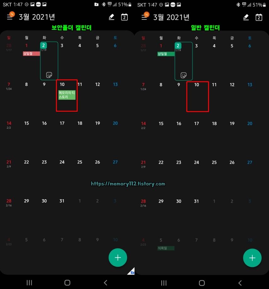 마찬가지로 보안 폴더 내에 있는 캘린더도 보안폴더 내에서 독립적으로 저장되고 실행됩니다. 만약 따로 은밀히(?) 관리해야 할 일정이 있다면 보안 폴더 내에 있는 캘린더를 이용하세요.