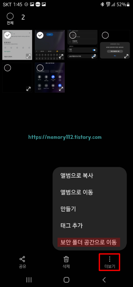 갤러리에서 사진 선택을 하고, 더보기에 있는 '보안 폴더 공간으로 이동'을 누르면 사진을 보안폴더로 이동시킬 수 있습니다.