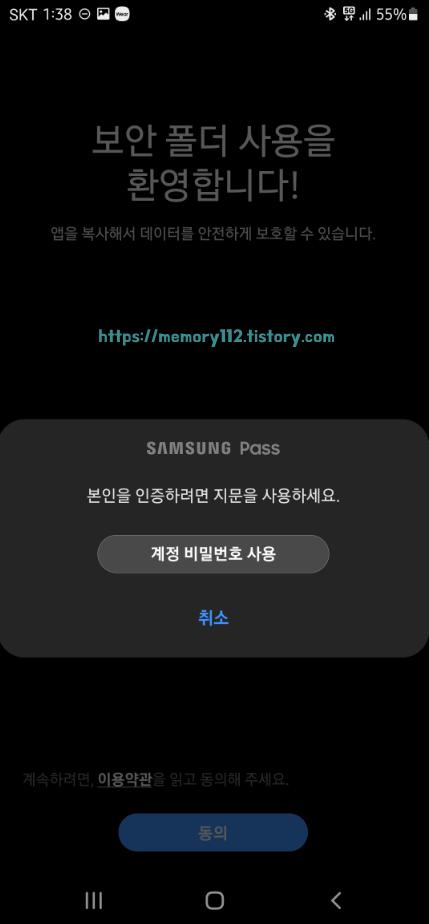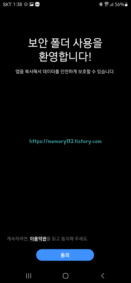 그러면 이렇게 "보안 폴더 사용을 환영합니다."라는 메시지가 나올 텐데요. 여기선 그냥 동의 버튼만 눌러주면 됩니다.