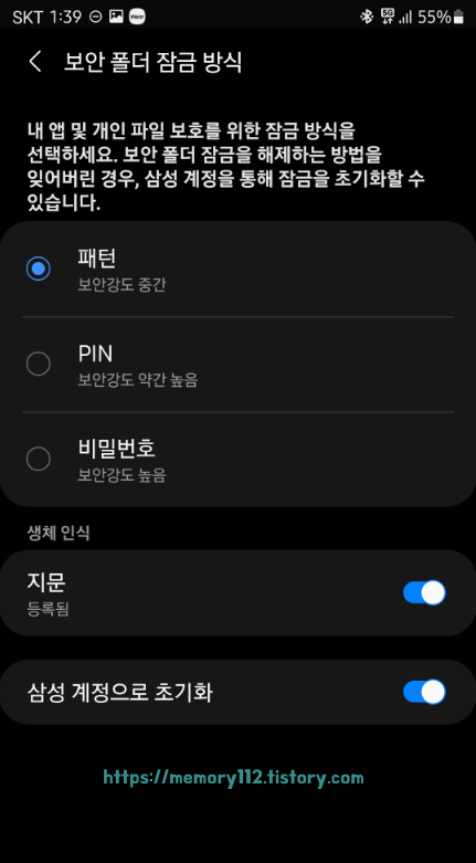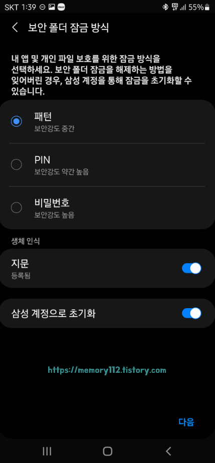 앞으로 사용할 보안 폴더 잠금 방식을 선택해줍니다. 잠금 방식으로 패턴, PIN, 비밀번호 중 하나를 선택할 수 있으며 지문 인증 사용은 선택 사항입니다.