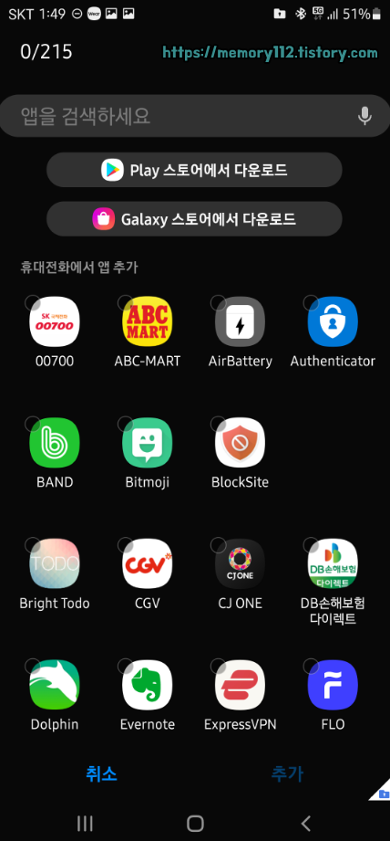 그리고 여기서 보안폴더에 사용할 앱을 체크한 후, 우측 하단에 있는 추가 버튼을 눌러줍니다.