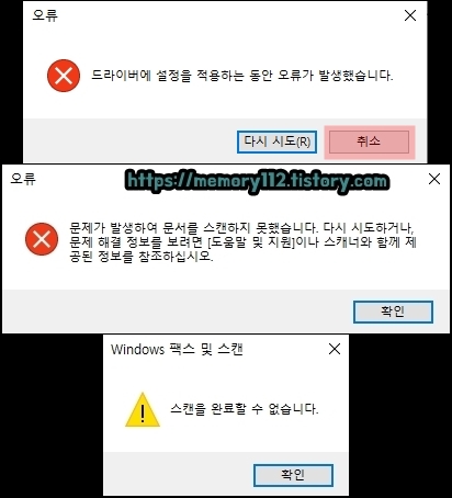 그리고 취소 버튼을 누르면 "문제가 발생하여 문서를 스캔하지 못했습니다."라는 메시지와 "스캔을 완료할 수 없습니다."라는 메시지가 떴다. 당연하게도 스캔 기능은 작동하지 않았다.