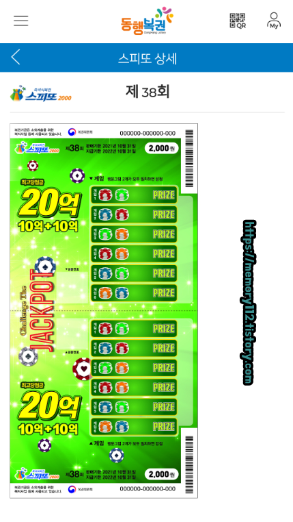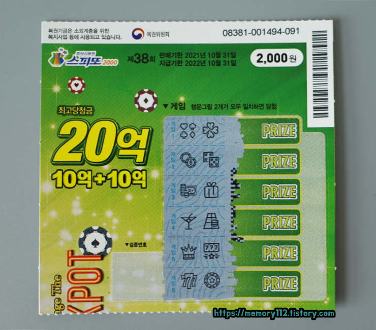 스피또 2000 38회 차 복권 디자인은 이렇습니다. 완전 초록 초록하네요. 눈부셔..