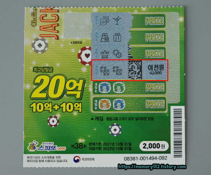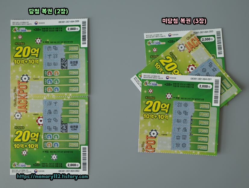 ※ 1등 당첨금이 10억인데. 최대 당첨금이 20억이라고 적혀있는 이유는 스피또 2000은 1등 당첨 복권이 2장 연달아 발매되기 때문이다.