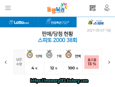 21년 05월 07일 금요일 기준, 남은 당첨 복권은 1등(10억원) 4매, 2등(1억원) 12매입니다. 그리고 3등(1,100만원)도 100매 정도 남아있네요.