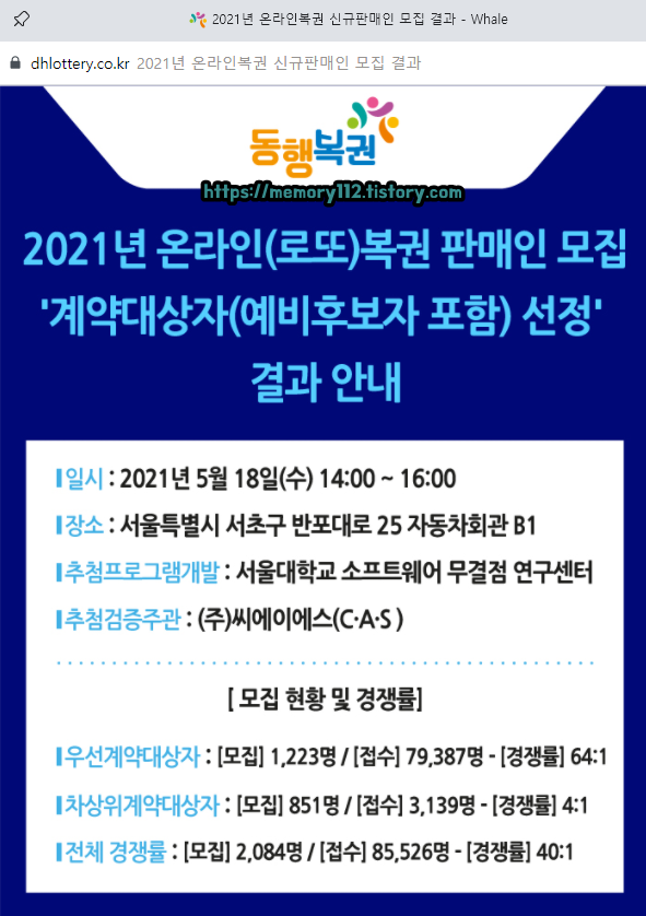 2021년 로또복권 판매인 추첨은 21년 05월 18일 수요일 14시부터 16시까지 '서울특별시 서초구 반포대로 25 자동차회관 B1'에서 진행됐으며, 모집 경쟁률은 다음과 같습니다.