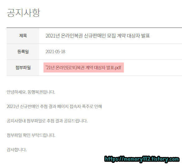 만약 접속자 폭주로 로또 판매인 추첨 결과 페이지에 접속되지 않는다면, 동행복권 공지사항을 확인해줍니다. 참고로 제목은 "2021년 온라인복권 신규판매인 모집 계약 대상자 발표"입니다.