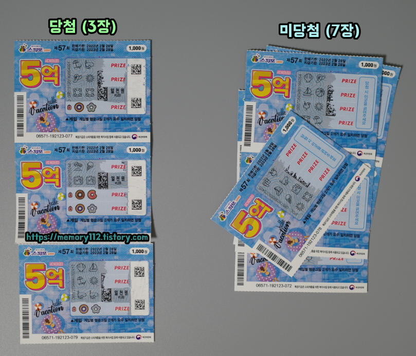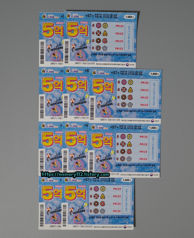 이번에는 스피또1000 57회차 복권을 준비해봤습니다. 수량은 총 10장으로, 복권 구매 비용으로 총합 10,000원이 들어갔습니다. (월급이 그냥 스쳐 지나가는 흙수저 입장에선 대단히 거금인 것임)