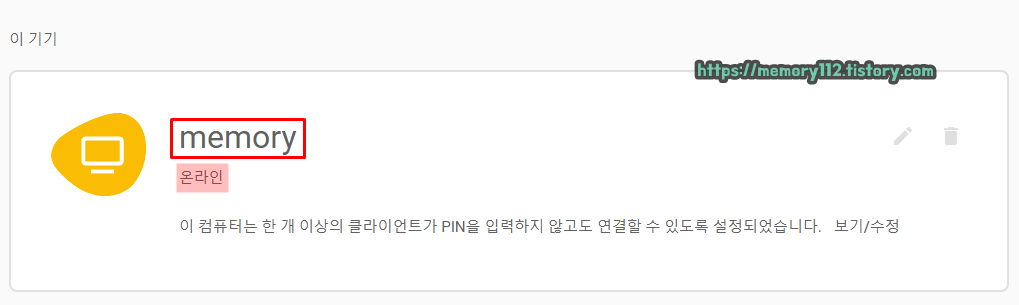 원격제어 대상이 되는 컴퓨터가 켜져 있는 상태라면 위와 같이 '온라인'으로 표시되는데요. 여기서 컴퓨터 이름(memory)을 클릭하면 원격제어 연결할 수 있습니다.