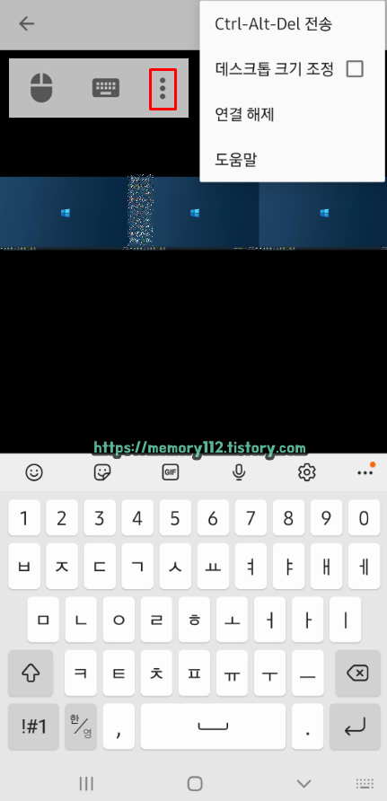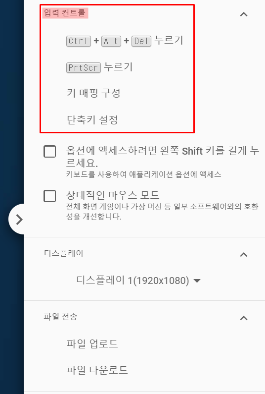 우측 상단에 보이는 설정(점이 3개 찍힌 것)을 누르면, 여러 가지 원격제어 옵션을 건들 수 있습니다. 그런데 PC에 비해선 원격제어 옵션이 많이 없죠?