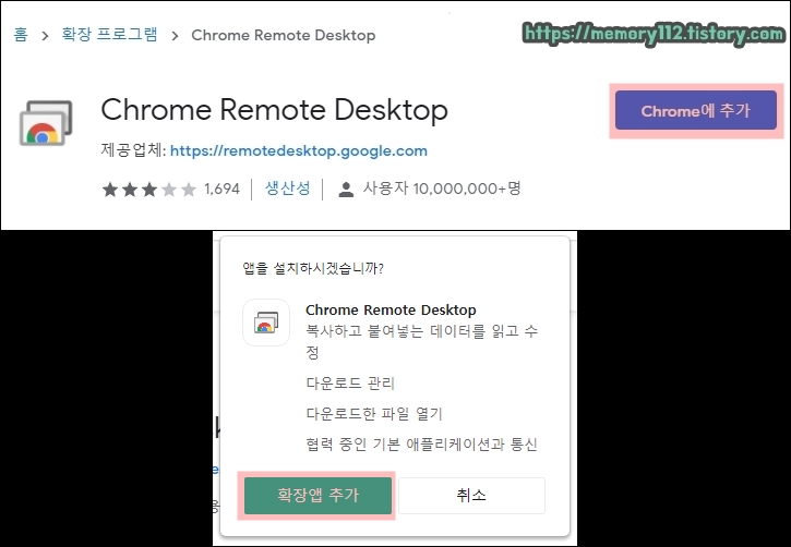 그러면 확장 프로그램 다운로드 및 설치 화면으로 이동되는데요. 여기서 'Chrome(크롬)에 추가'를 누른 후, 이어서 '확장앱 추가'를 눌러줍니다.