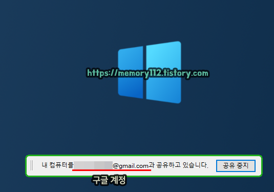 구글 원격제어 데스크톱 연결이 완료되면, 원격 제어 대상이 되는 컴퓨터에 '내 컴퓨터를 (구글 계정)과 공유하고 있습니다.'라는 메시지가 뜰 것입니다. 그리고 이제부터 원격제어를 마음대로 할 수 있습니다. (마우스와 키보드 입력을 자유롭게 할 수 있음)