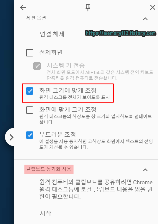 추가로 우측에는 디스플레이 지정 이외에 다른 여러 가지 원격제어 옵션이 있는데요. 이 중 '화면 크기에 맞게 조정(원격 데스크톱 전체가 한눈에 보이도록 표시)'은 기본적으로 체크되어있는 옵션입니다. 여러 가지 원격제어 옵션을 통해 본인에게 맞는 원격제어 환경을 만들어보세요.